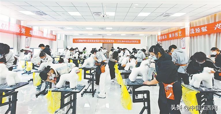 11月30日,江西生物科技职业学院学生正在参加“1+X”宠物护理与美容职业技能等级证书实操考核。(受访单位供图)
