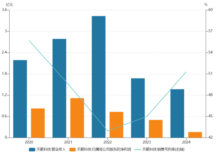 天箭科技上市前(2017-2019年)毛利率常年维持50%左右,到2025年半年报下探至41%。