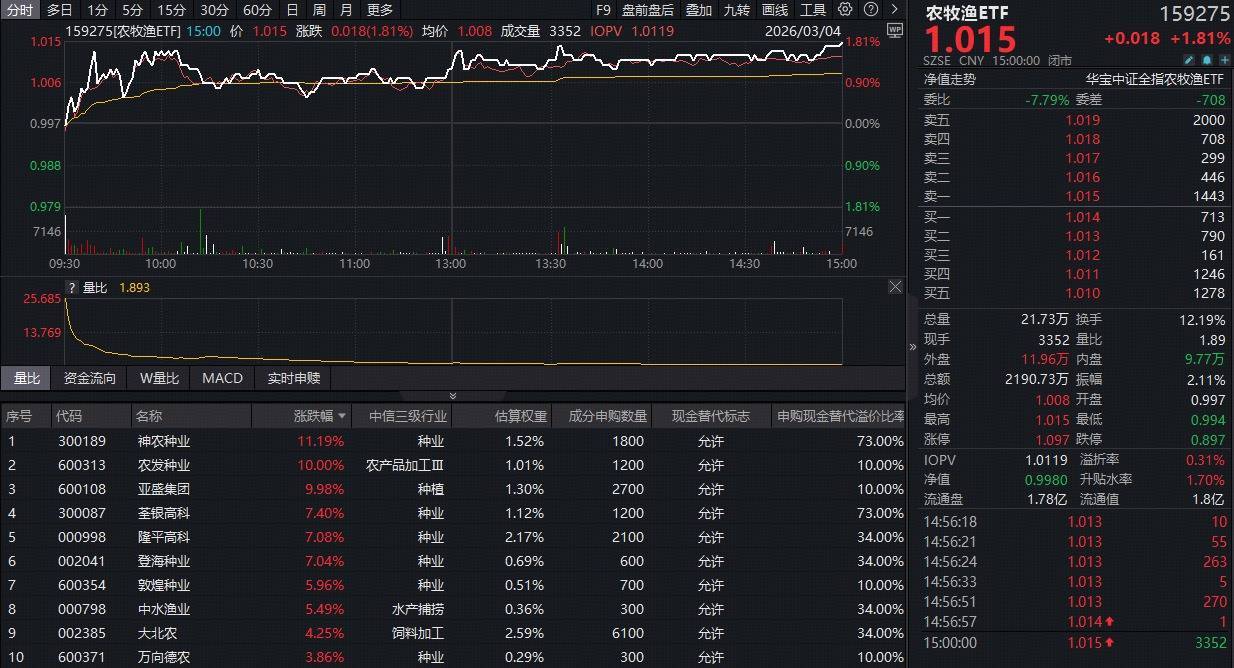 一、利好政策密集出台!种业掀涨停潮,农牧渔ETF(159275)逆市大涨1.81%!机构:板块配置价值明显上升