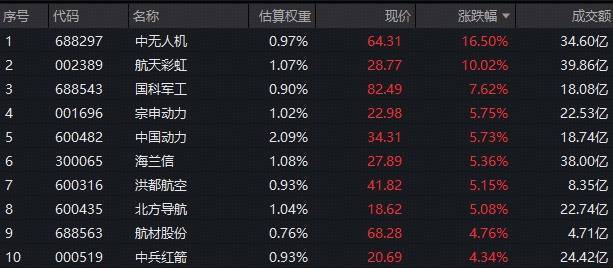 航空航天、地面兵装、航海装备相关成份股涨幅居前,中无人机盘中飙逾18%创历史新高,航天彩虹涨停3天2板,国科军工涨7.62%,宗申动力、中国动力、海兰信等多股涨超5%。